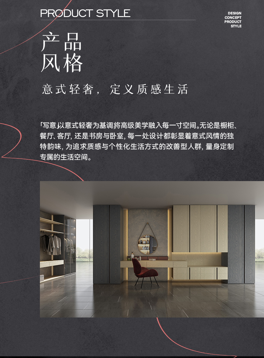 “寫意”,以意式輕奢為基調(diào),將高級美學(xué)融入每一寸空間,為追求質(zhì)感與個(gè)性化生活方式的人群量身定制。它不僅僅是一套家居產(chǎn)品,更是對精致生活的完美詮釋。