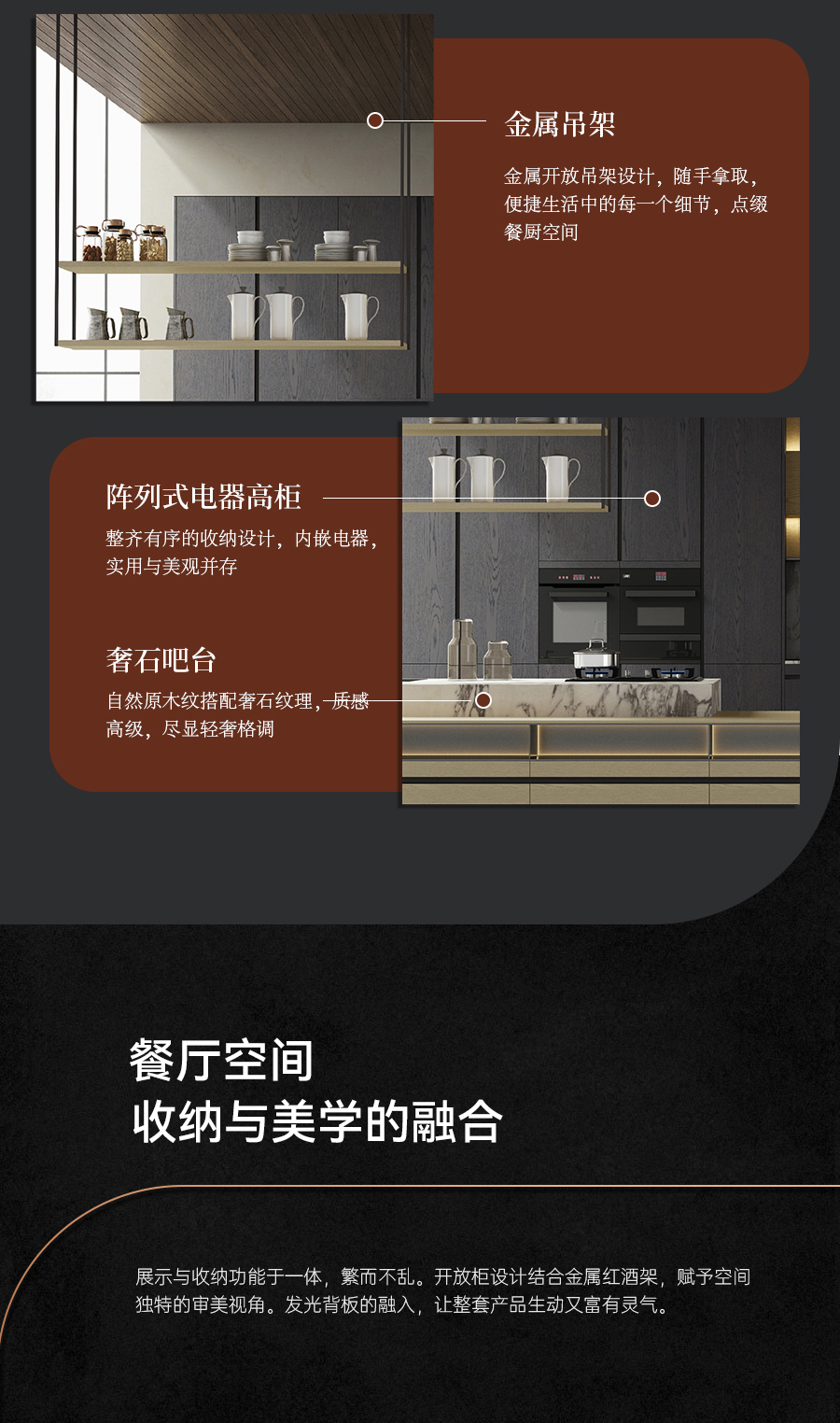 在空間應(yīng)用上,“寫意” 系列更是表現(xiàn)卓越。櫥柜空間中,餐島一體式西廚設(shè)計(jì),開放式布局增加了家庭互動性;餐廳的收納空間,將美學(xué)與實(shí)用完美結(jié)合;客廳以輕盈與質(zhì)感的碰撞,展現(xiàn)獨(dú)特魅力;入戶空間藝術(shù)與功能交織;書房運(yùn)用對稱與圍合手法營造靜謐氛圍;臥室則實(shí)現(xiàn)了舒適與優(yōu)雅的平衡。每一個(gè)空間,都承載著對美好生活的向往。