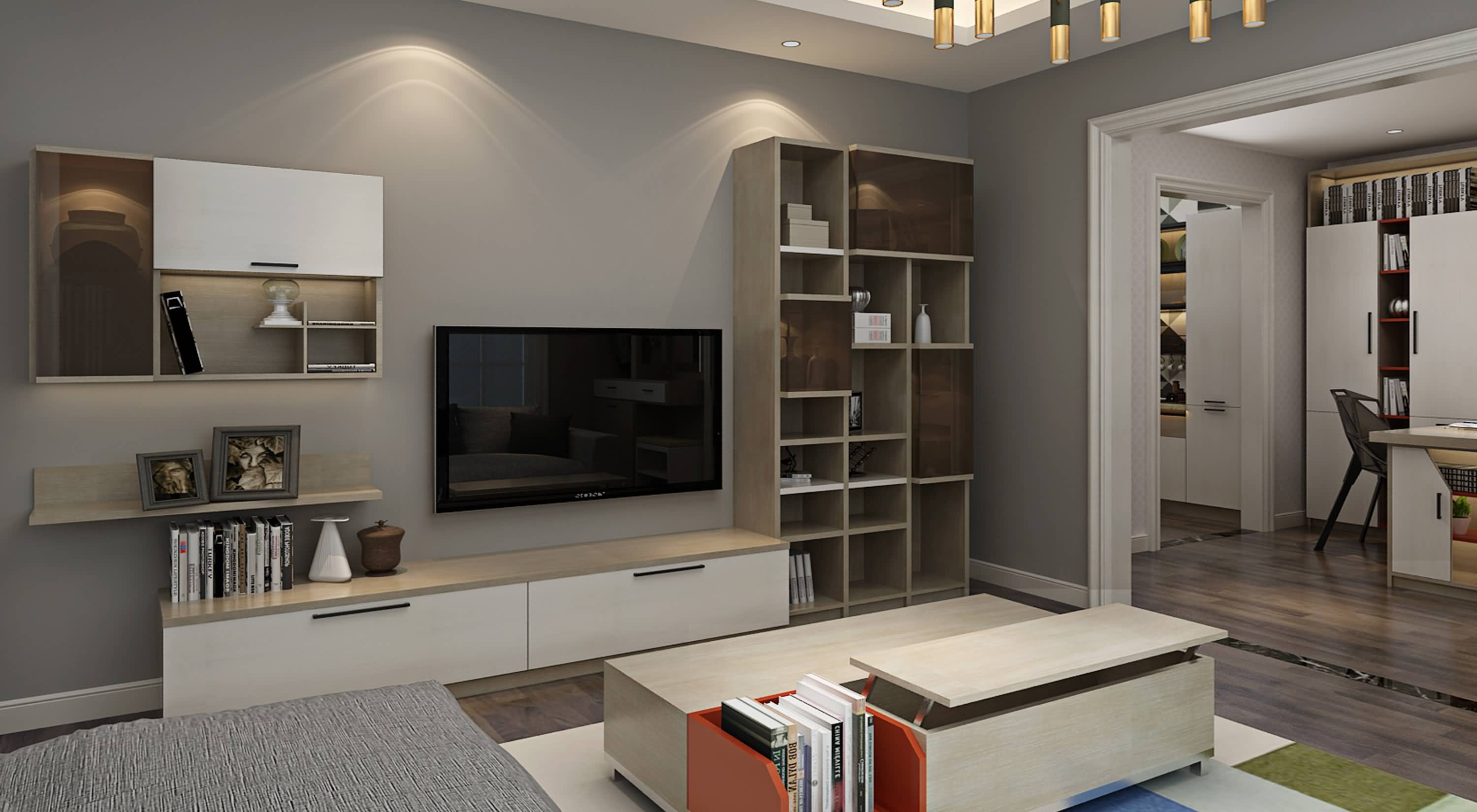 電視柜柜體采用雙面玻璃合頁, 凹凸的層次感正是設(shè)計師理念 的體現(xiàn) |